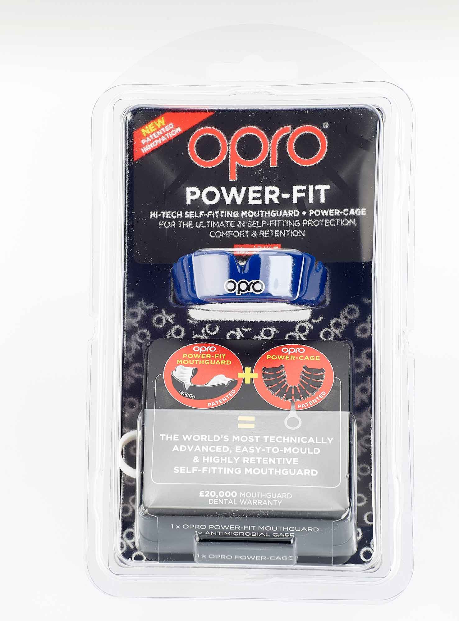 Der OPRO PowerFit ist ein völlig neuartiger Zahnschutz. Dieser Zahnschutz hat 2018 den ISPO Gold Award gewonnen, die größte Auszeichnung eines Sportgerätes von der Jury der weltweit größten Sportmesse. Die Innovation des PowerFit besteht in der einzigartigen Art der Anpassung, die dafür sorgt, dass Sitz und Comfort des PowerFit einem Custom Fit Zahnschutz, also einem Zahnschutz, den ein Zahnarzt für Sie direkt anpasst, so nahe kommt, dass Sie den Unterschied kaum bemerken werden. Die beiden mitgelieferten Spangen werden beim Anpassen um den Zahnschutz gelegt. Sie beißen dann nach dem Erhitzen im Wasserbad mit den Zähnen Ihres Oberkiefers in den Zahnschutz, unten beißen Sie auf die weiße Spange. Dadurch kommt es unten zu keinen Beschädigungen am Zahnschutz, die Sie später stören könnten. Weiterhin schließen sich die Verzahnungen der weißen Spange um die der schwarzen Spange, wo Ihr Zahnschutz liegt. Diese Verzahnungen wiederum schießen sich sehr eng um den Zahnschutz und werden von Ihrer Bissbewegung um den Zahnschutz verengt. Dadurch schmiegt sich der PowerFit eng um Ihre Zähne und passt wie angegossen.